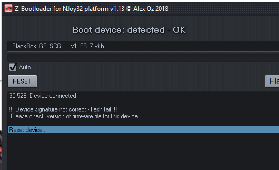 I have a VKB-Sim Gunfighter Vintage KG12 grip and I have an SCG-L Space Combat Grip. I want to use the SCG-L grip on the base that the KG12 came on. Well, I tried to update the Black Box firmware so it can see the SCG-L grip. I get an error stating that the "device signature is not correct". The version of the controller is v1.96D. Has anyone run into this problem and has a solution for it. I followed the instructions but whatever I do and whatever firmware I try I get the same error.