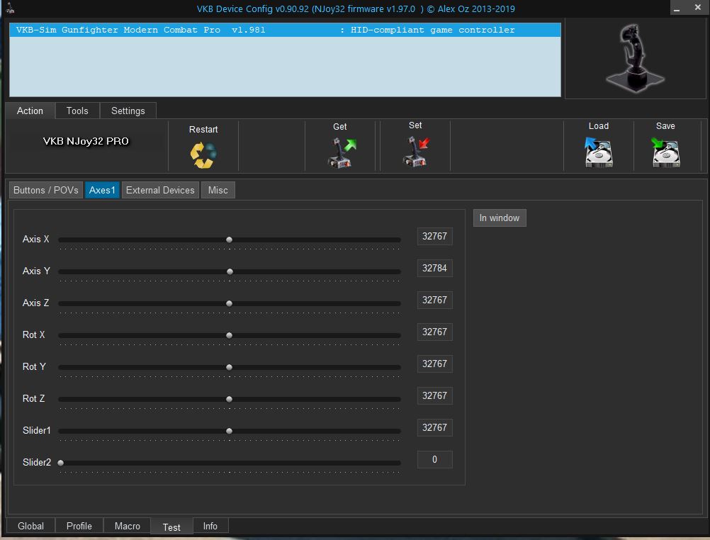 The screenshots show the buttons & axis in DevCconfig without touching the stick so you can see that all looks normal.