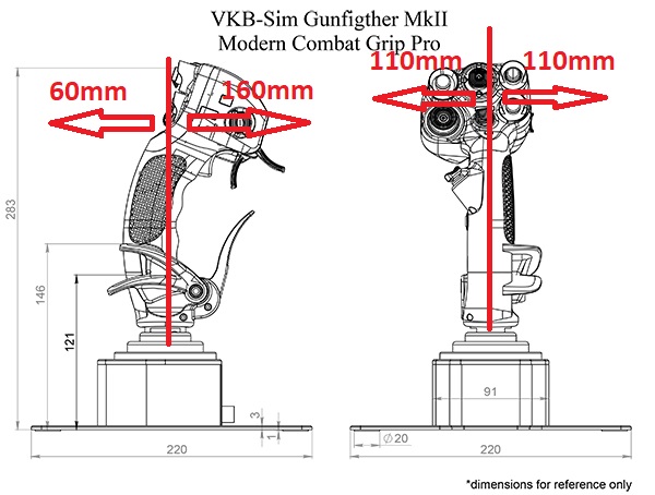 Hi guys, I'm planning to buy a gunfighter III stick, modern combat pro grip. I have a sim rig with a very reclined seat and sidestick configuration. Could you post or forward me scale drawings of said stick, preferably in centered and fully deflected positions, with and without the available extensions? I need to check clearances and ergonomy in order to decide which configuration is best.