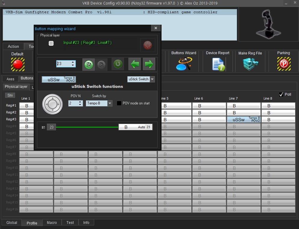 Thank You. I have twist axis and I have the trudder axis. It's working now...but this setup swapped functionality of POV hats. Now the Left circle hat has the 2seconds press (switch from XY sliders to pov hat with reset with single press) and the top rectangle hat has simple 4way hat function. Before the top rectangle hat has the switch pov/sliders (default factory) functionality. How to bring the default hat functionality and have the twist and trudder axis?