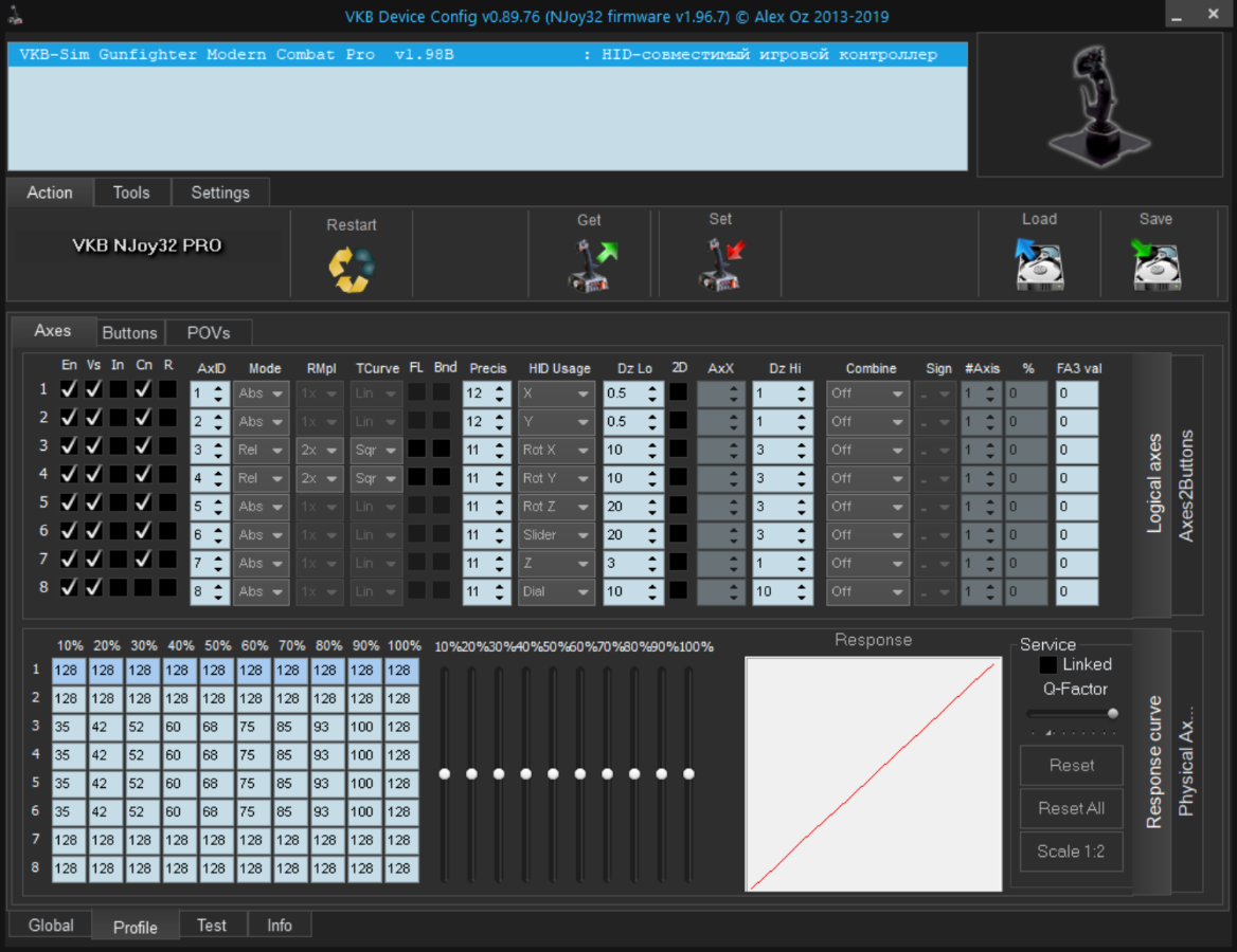 А профиль уже есть - дефолтный. В нем кнопки срабатывают, оси откликаются. Невозможно сделать всем удобный профиль из такого количества кнопок. Нужно это делать самому и никак иначе.