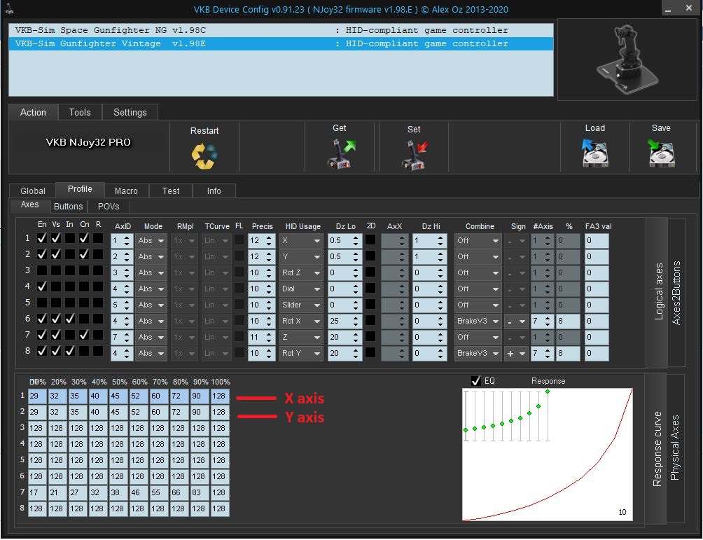 I've increased the values of x and y axes to 2.0 and see no difference in results. After making the adjustment I Calibrate and Set and the app tells me "No new data". I launch the game and the plane still drives like a dump truck. Not a good attribute for a fighter. I have set Dz Hi for Y axis to everything from 5.0 to 0.5 and there is no difference.