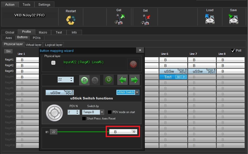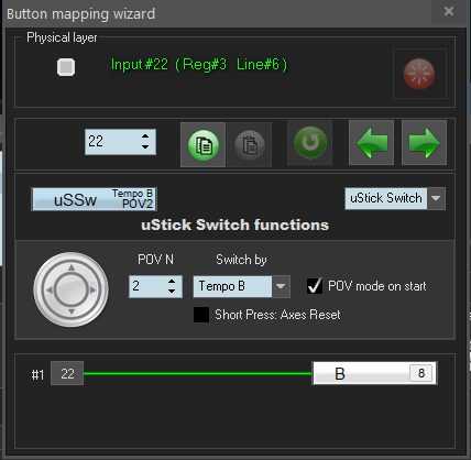 Set physical button 22 as uSSw for POV2 switched by TempoB. Link it to physical button 30: