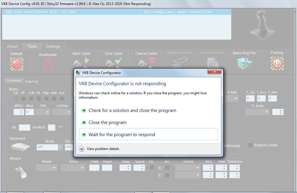 Again the versions are VKBDevCfg-C 0.91.30 and ZBootloader-C 1.13, and I'm using Windows 7 Pro 64-bit. I hope I've provided enough data to diagnose the problem. Help?