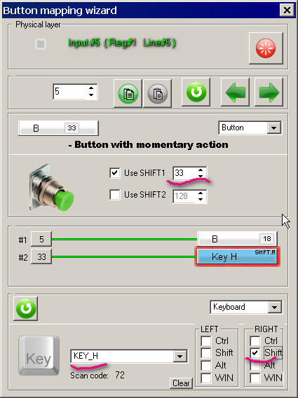 Once I'm in this second mode. When I press, say, button 18 it would be bound to a keystroke like R.Shift-H.