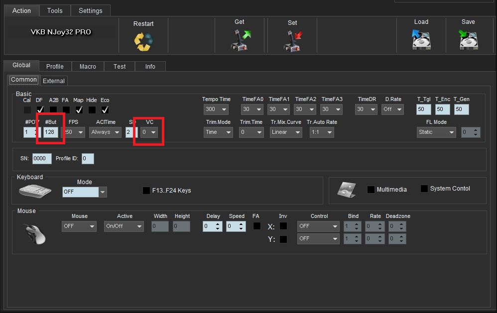 10.2. Split your device into several virtual controllers by going to Global/Common, setting up the #Butt to maximum allowed by game (32 for E:D/SC or 64 for SC/Il-2) and setting up the number of virtual controllers by dividing the total number of buttons (which is 107) to maximum of button number allowed by game: this would be 4 virtual controllers for E:D (set up the VC to 3), 3 virtual controllers for SC (set up the VC to 2), 2 virtual controllers for Il-2 (set up the VC to 1); DCS does not need any changes. Press Set button in Action tab to save the changes. After this, the game will recognize the same device as several controllers, as many as set in VC, with as many buttons as set in #Butt.