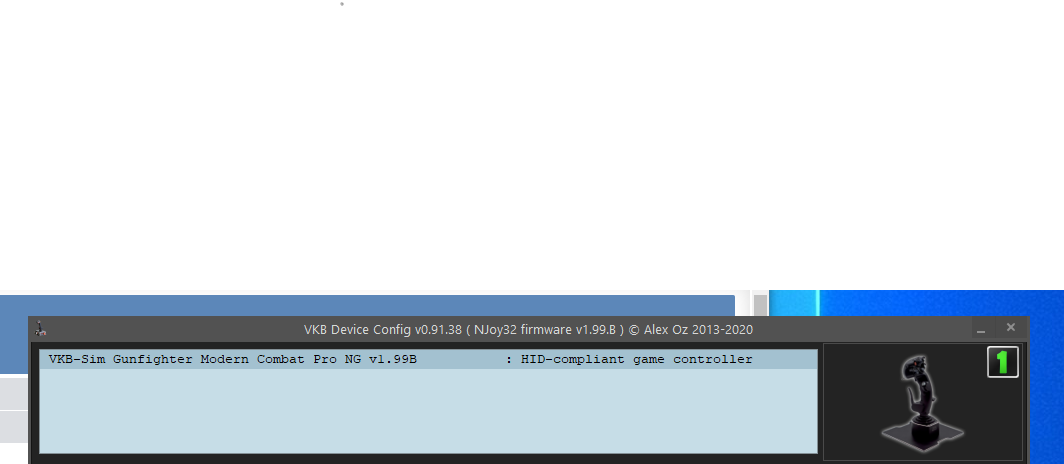Hi, I have a MCG Pro stick ( Gunfighter Mk.III, upgraded from Mk. II) with the orange black box. I'm trying to flash the firmware file _BlackBox_GF_MULTIDEVICE_v1_99_B NG.vkb (I've tried all versions starting with 99_0) using VKBDevCfg-C_v0.91.30.exe. The firmware loads with no errors but I have 3 issues when trying to calibrate the MGC Pro (and after):