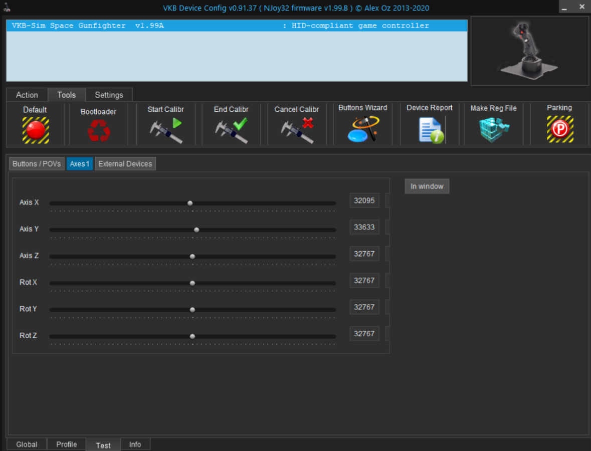 I got my Gunfighter Mk. 3 base and Premium SCG (R) grip today. I was following along with the VKB software tutorial for the stick (https://www.youtube.com/watch?v=mCajFZ9 ... e=youtu.be) but when it came to the calibration step I found that neither the twist axis nor the grip hat axes showed any input besides the default values (32767). I.e. only the base's X and Y axes are recognized.