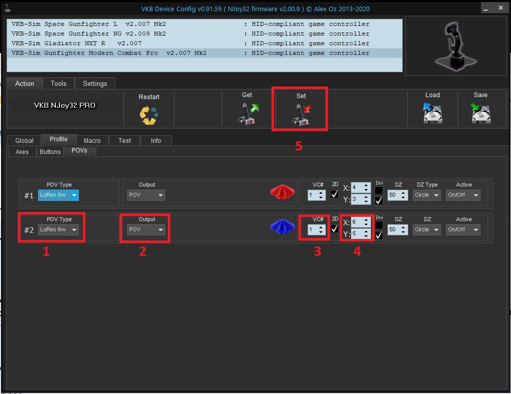 Second photo: Set up the second POV as LoRes 8w, or you could set up as LoRes 4W for 4 buttons instead of 8 (1). Output is POV (2), VC# 1 (3) and axes are 5 and 6 (4). Now press the Set button to save the changes (5).