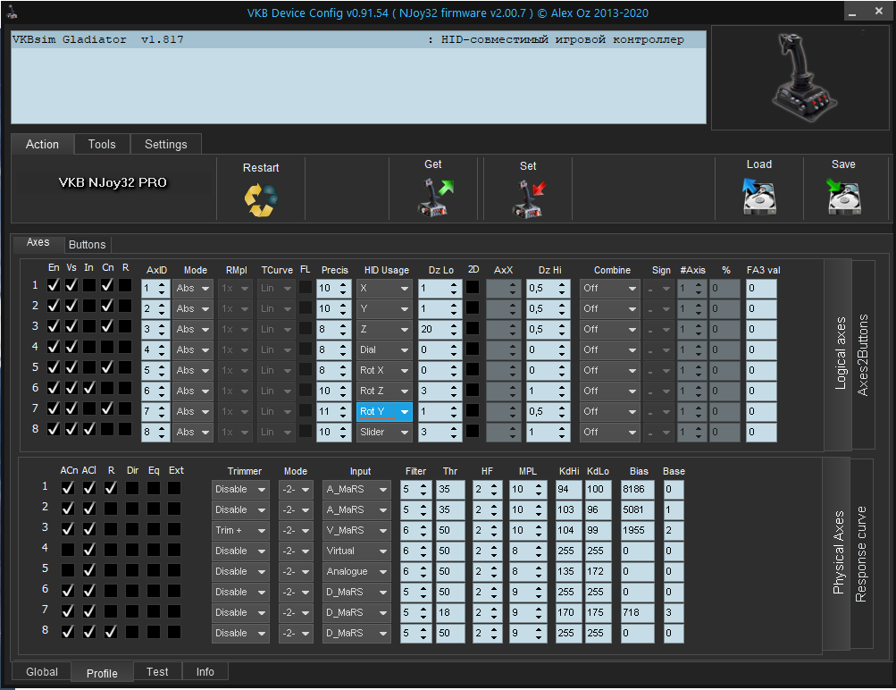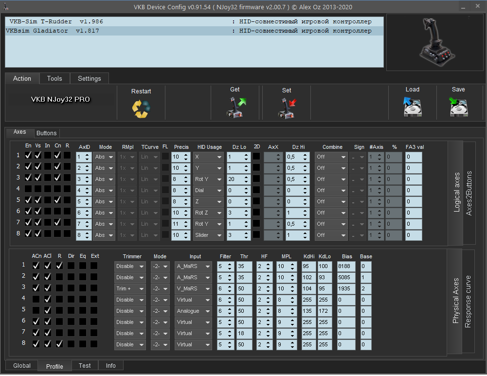 Вот финальные параметры с которыми Gladiator подхватил педали. Может кому-то пригодится потом.