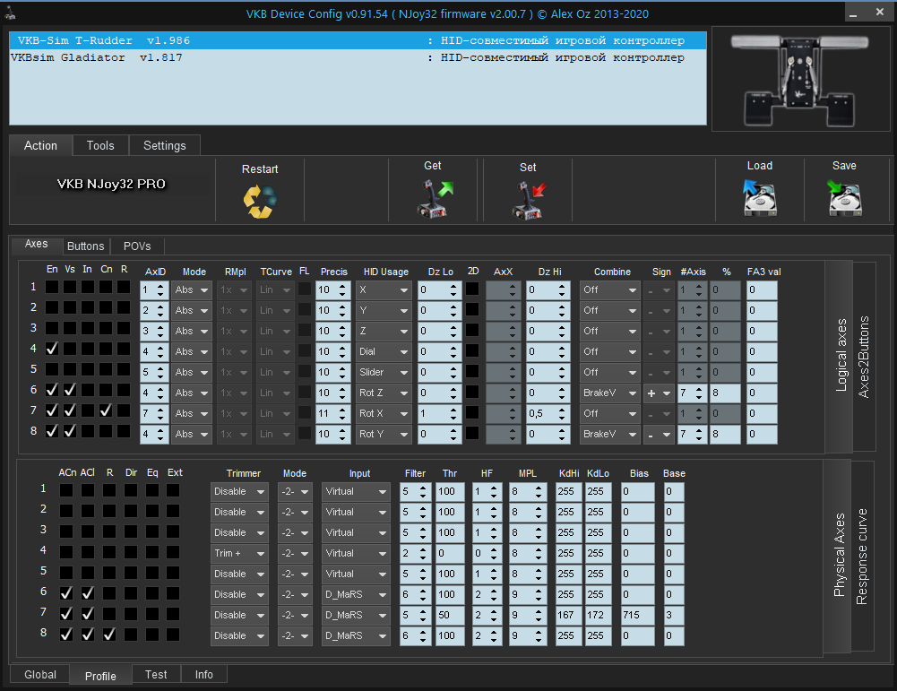 UPD2: Итого несколько часов попыток как-то синхронизировать оси и заставить работать педали через джойстик, не принесли никакого успеха. Устройства могут работать исключительно как отдельные. Я не знаю каким образом можно выполнить шаг 4 и 5 в официальной инструкции к педалям. Это просто не работает, я даже не знаю тестировалось ли это инженерами ВКБ. Для чего был придуман разъем PEDALS на Gladiator MKII я также не знаю. Чтобы отвязать функцию твиста от джойстика и иметь возможность назначить туда что-то другое нужно в DevCfg назначить другую функцию на ось, например Rot Y. Только в таком случае исчезнет дублирование функций (педали + твист) и можно на тот же твист назначить раздельные тормоза например.