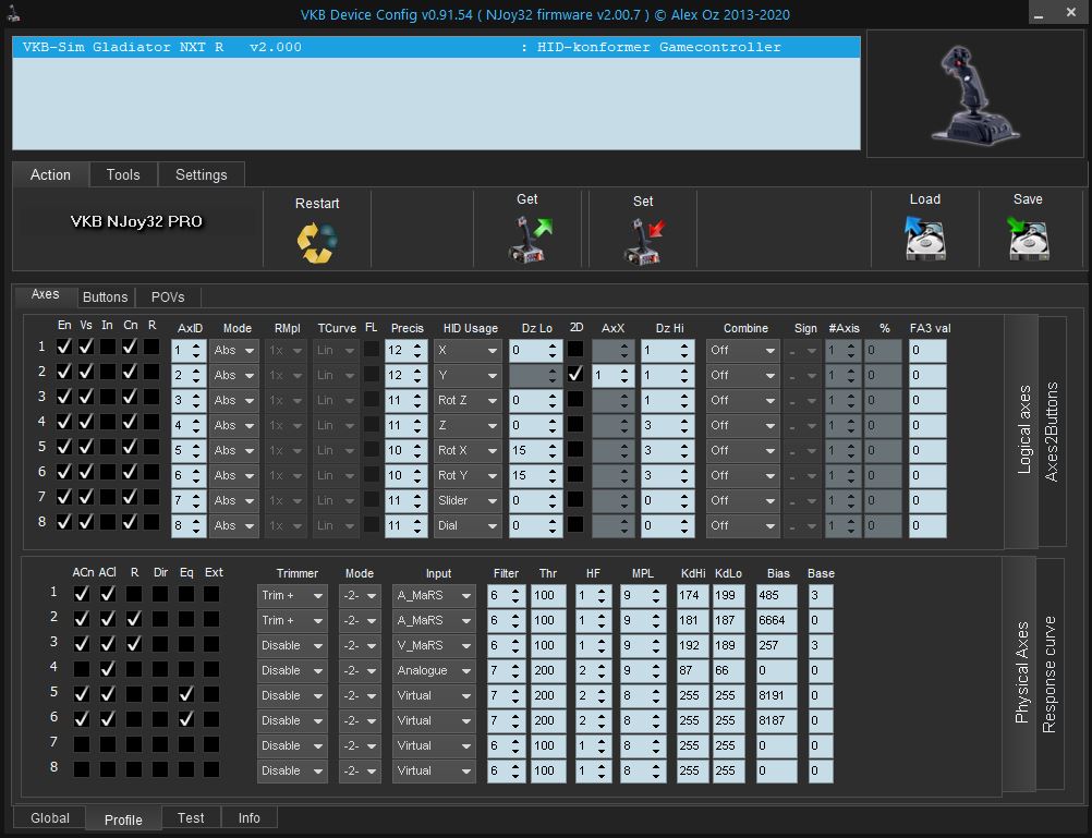 When I use VKBDevCFG-c.exe to test the Sticks' sensitivity, I can move the X and Y axes from the center position of 32767 to as little a deflection as 32848. When I try to twist the RotZ-axis as little as possible to the right, I can modulate the Position to as high as 32832 with just pressure. But as soon as I overcome the pressure of the initial friction and the twist axis starts actually moving, It jumps to a position like 38000 or 41000. That is with all deadzones set to DzLo=0,0, of course. And it doesnt help to put my arm in a different position to reduce the vertical pressure on the grip.