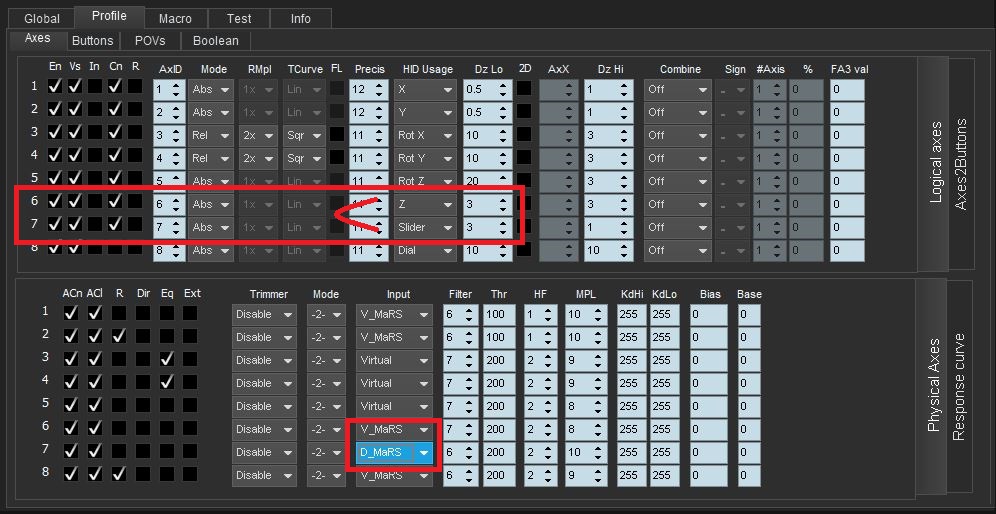 Then, in Physical Axes panel, set up the Input for axis 6 (twist) as V_MaRS and the Input for axis 7 (rudders) as D_MaRS.