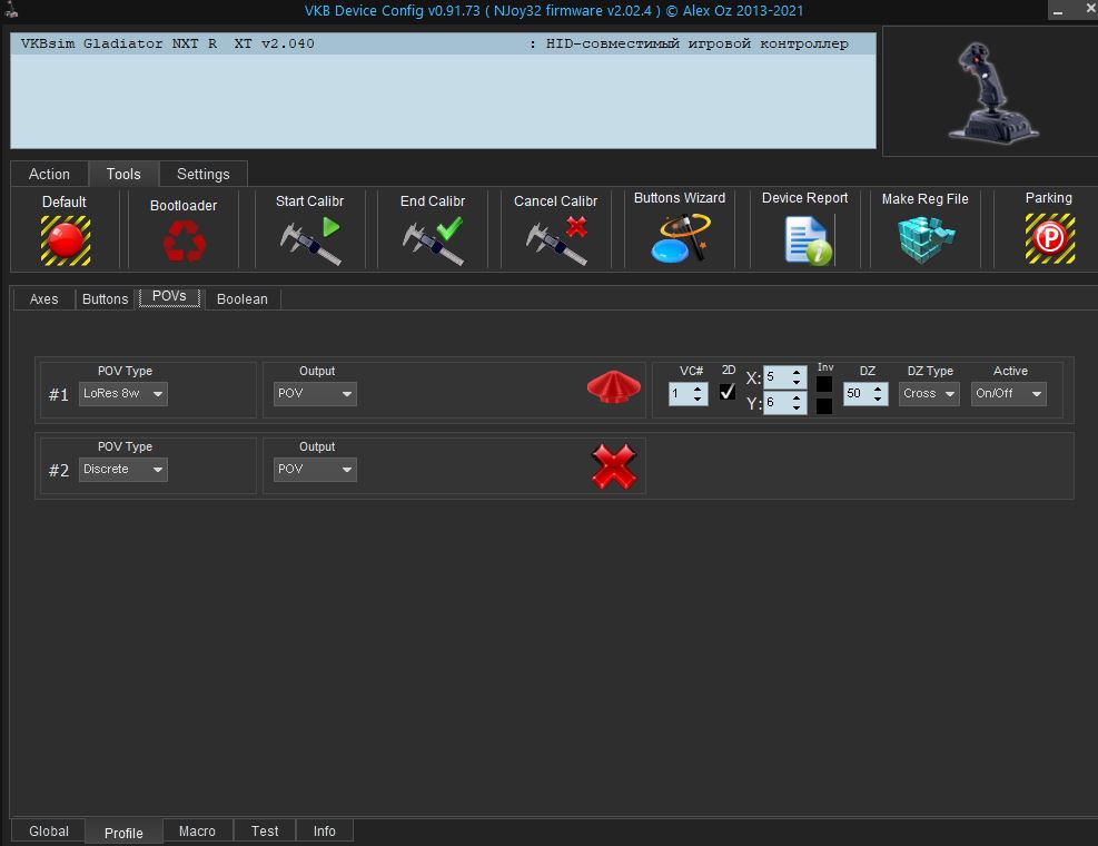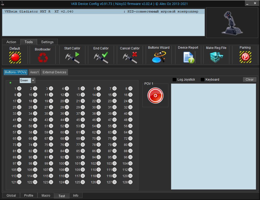 Вообщем продолжаю свои эксперименты. Поставил опять 40 прошивку, кнопки Хат А1 в закладке Тest не работают, если поставить чек на Poll, то отклик показывает (см. Скрин, зажал хат вправо), но во вкладке Test всё равно глухо