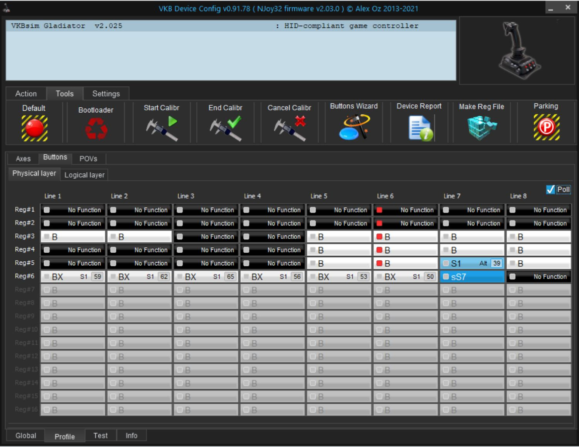 Post 2 screenshots: Profile/Buttons/Physical and Logical. Don't cut off the header, post the whole window.