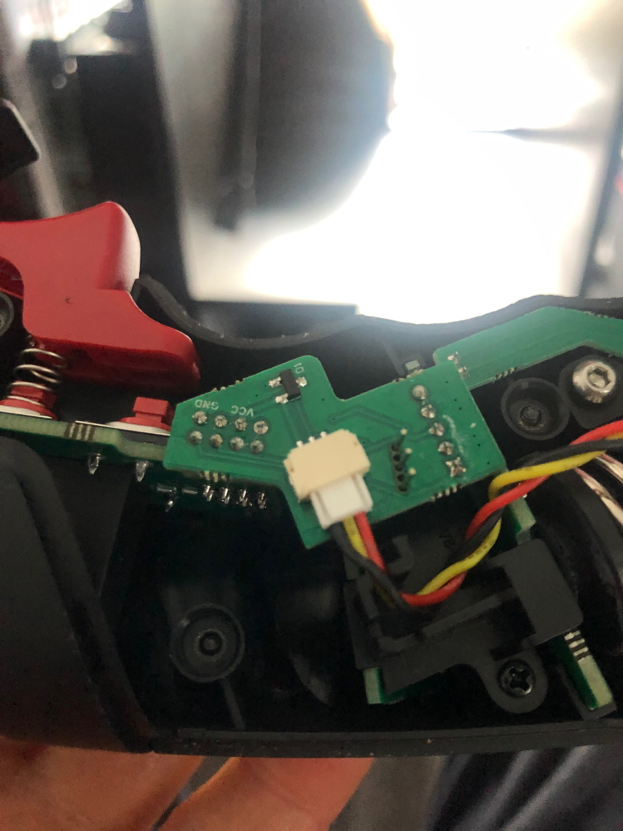 If you look at my photo above, you'll see the board on the base shows GRND on the right hand side of the connector and 3.3 on the left. That's opposite of what the photo the other user posted, trying to show me the order of the wires. On a multimeter, plugging the COM wire into the 3.3 (left) side and the VmA probe into the GRND (right) side, gets a -3,3 value. As such, I assumed that the markings on the board were actually correct, opposite of the photo posted by the other member (grnd on top (left in my example) and 3.3 on the bottom). So, I went with the red wire to the left and the black wire to the right of the connector, plugged it in and the pc didn't recognize the controller at all. unplug the stick-to-base connection harness, pc recognizes. Now I'm thinking, maybe the wires and connector on the stick are reversed. Checked wires for continuity, all good. Swap wires on the stick, so now its red (3.3) on top and black (GRND) on bottom and the LED lit up for the first time since plugging this (#&#**$& controller in! alas, short lived. LEDs go out and pc still doesn't recognize twist or any stick-mounted button presses.