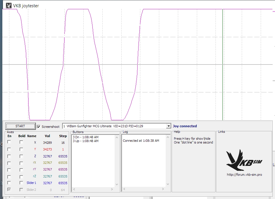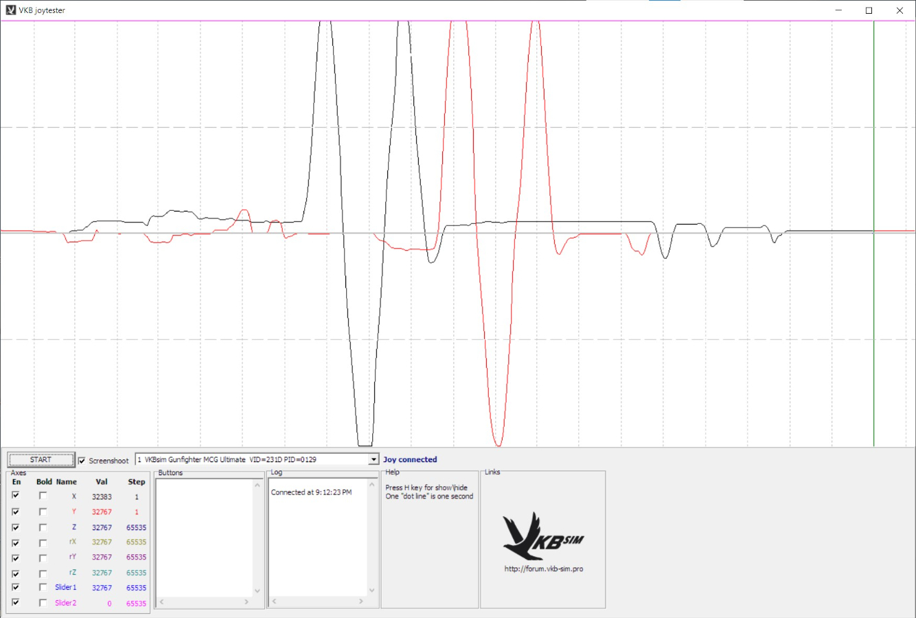 I'm afraid that I do not see the trigger axis with this profile. To be clear, I started VKBDevCfg-C.exe and then pushed the Default button. I then loaded this profile and pushed the SET button to load it into the device. I then closed VKBDevCfg-C.exe and started JoyTester.exe. I selected the MCG Ultimate device (since I have two other joystick devices on the same system) and then exercised the stick. I see X and Y movement but nothing from the brake lever or trigger axis.Screenshot below shows only the X and Y axes moving even though I moved all four.