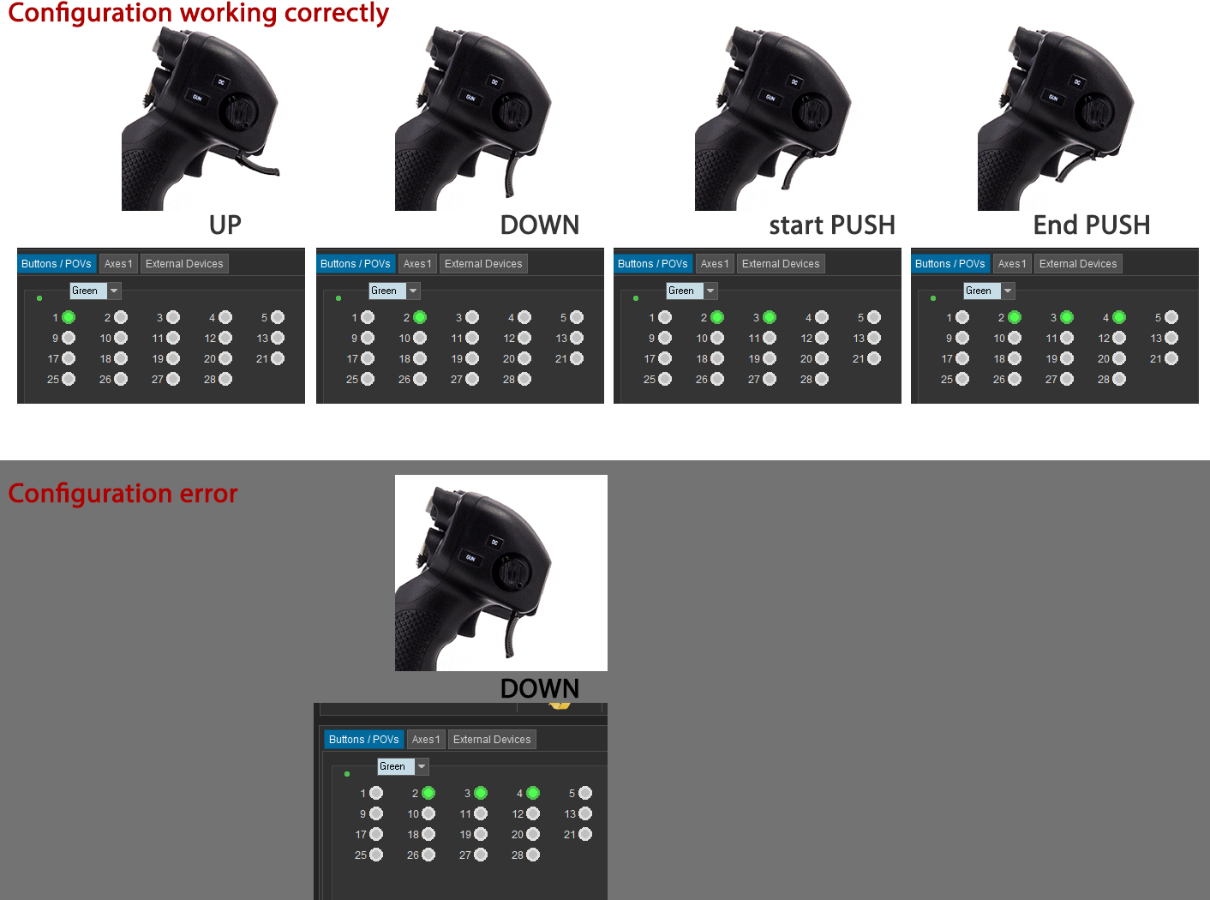 I have it configured with four virtual buttons. At the top position, it has a virtual button assigned (1). At the down position it has another virtual button (2), and then, as I press it I get the two other virtual buttons (3,4). When the error appears, the last three virtual buttons are pressed continually at the same time and It doesn't matter how I physically move the metal folding. The only way to cancel this triple press is by disconnecting the USB from the device.