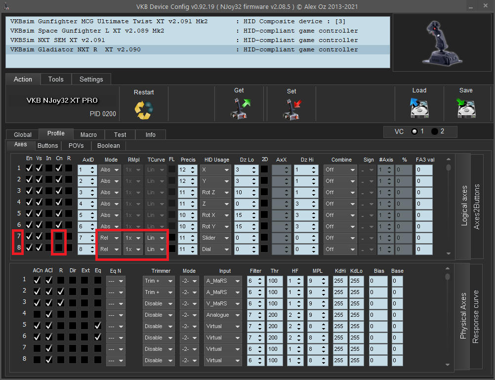 . In this example I'll use the ministick's analog axes (5 and 6) on a Gladiator NXT and assign the unused axes 7 and 8 as relative axes. I'll also uncheck the Cn option, so they won't get the center at half. RMpl and Tcurve could be adjusted depending on one's preferences.