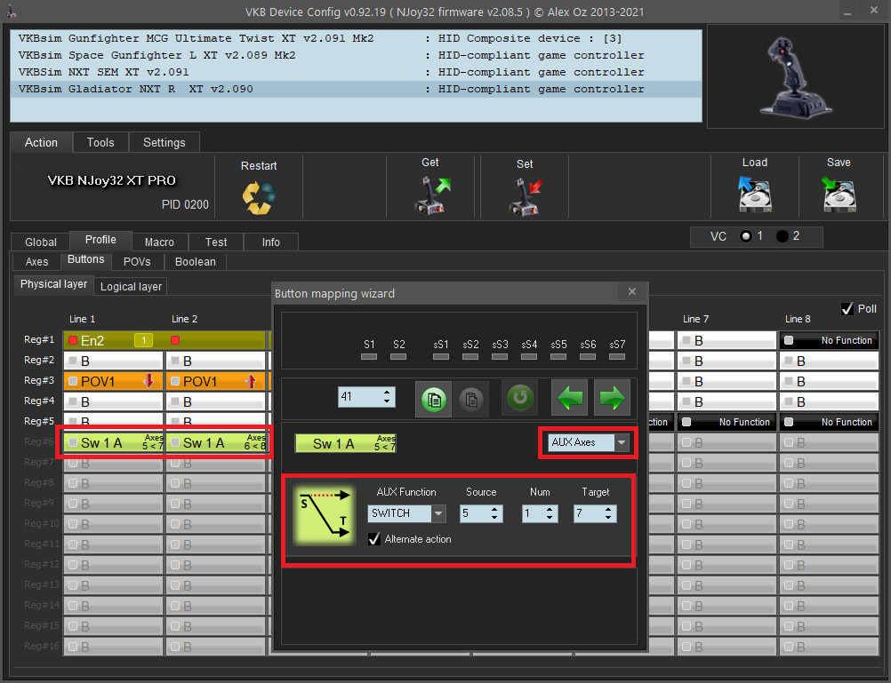 I'll set up physical button 41 as AUX Axes, functioning as Switch on axis 5 to axis 7, alternate. Same, button 42 becomes AUX Axes - Switch - axis 6 to 8 - alternate.