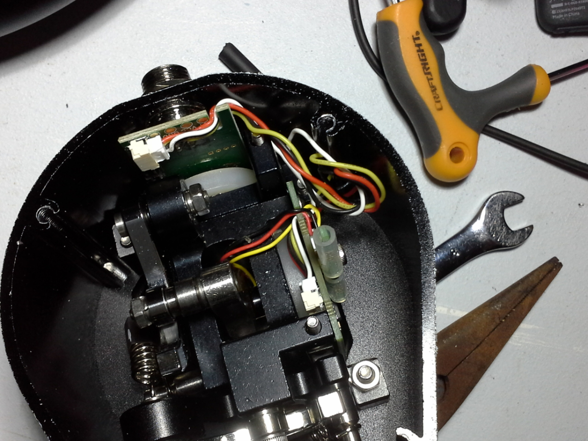 There are 3 pins spring activated on the bottom of the grip which are supposed to make contact with the 3 pads on the stem at the top of the base. For proper contact the pins will make some dents into the pads by design. If the grip is not properly secured to the base by the fastener, the user could press hard on it during flight and the pins would just dig deep gouges into the pads. At some point the gouges will get so deep the pins won't make contact anymore.