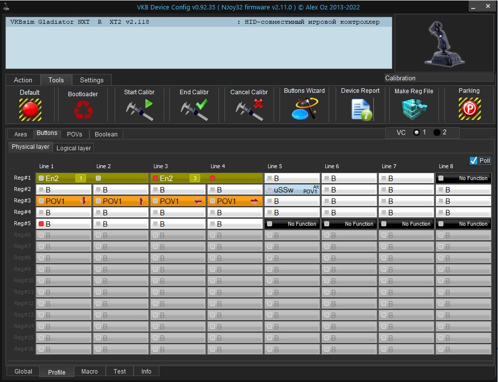 Обновите прошивку не ниже рекомендуемой (в шапке конфигуратора указана в скобках) отсюда. Затем сбросить в дефолт и заново сконфигурировать кнопкой Find&AutoConfig в External, откалиброваться. Показать скриншот из Profile-Buttons с активной галкой Poll не нажимая никакую кнопку.