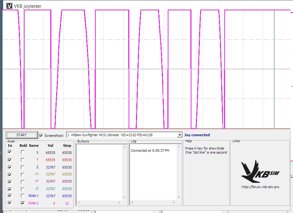 I'm afraid that I do not see the trigger axis with this profile. To be clear, I started VKBDevCfg-C.exe and then pushed the Default button. I then loaded this profile and pushed the SET button to load it into the device. I then closed VKBDevCfg-C.exe and started JoyTester.exe. I selected the MCG Ultimate device (since I have two other joystick devices on the same system) and then exercised the stick. I see X and Y movement but nothing from the brake lever or trigger axis.Screenshot below shows only the X and Y axes moving even though I moved all four.