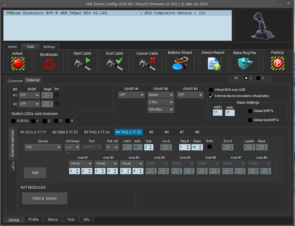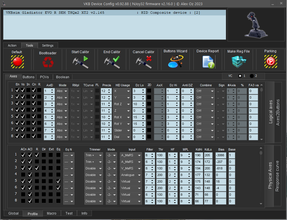 It is so close now. I have everything working except the 12th axis with is VC2 axis 4. As soon as I select the checkboxes En and Vs and then click the set button to send it to the joystick, it restarts and fails to start. I have to unplug it and hold F1 and F2. Then it restarts and I can load the saved profile with 11 axis set.