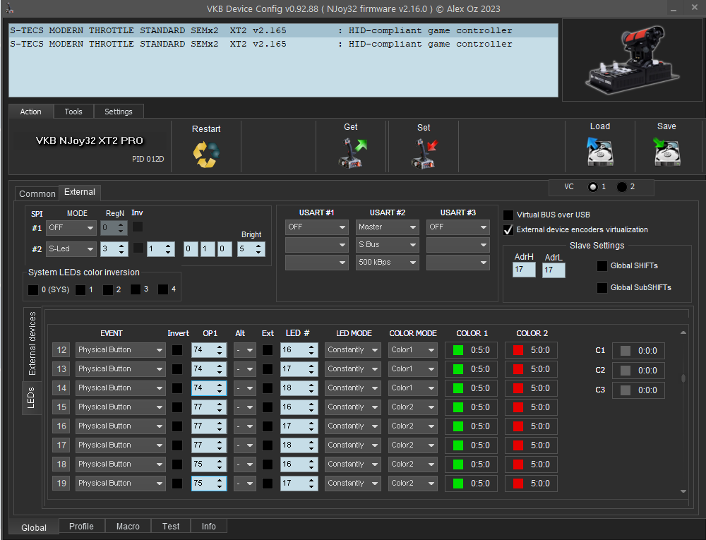 As for the LEDs responding, that can be set up in vkbdevcfg. If you scroll down the list of LEDs (global/external tab), you should find a set of six events where three consecutive LED numbers are controlled by two physical buttons. You may have to look around a bit, it is hard to describe more clearly over text when I do not have the device in front of me, and the exact numbering depends on your other connected devices. Anyway, if you change the OP1 (button number) on those, you can make them respond to different inputs, like the lever that is usually for flaps.