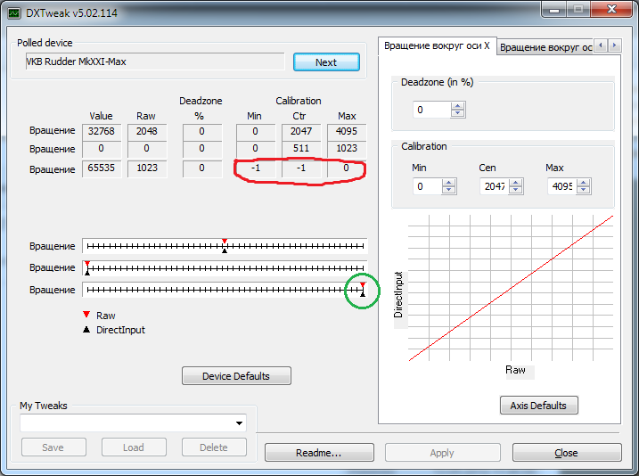 В Dxtweak2 откройте закладку последней оси и РУКАМИ пропишите в поля MIN, CEN, MAX значения 0, 511, 1023. Так же можете нажать кнопку Axis defaults. После этого жмем кнопку Apply.