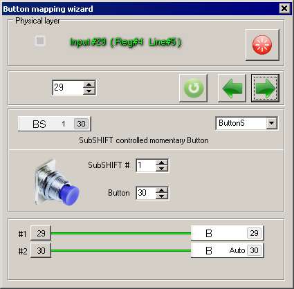 How it works. Slider in the middle, nor Shift1 nor Shift2, thus Shift0. Push my red button and see 29 in joytester. Push and hold subshift, push red button and have #30.