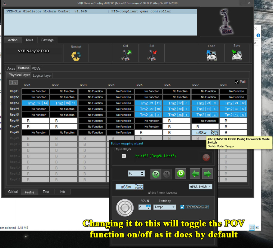1. Top/Centre ministick (labeled as "Master Mode") to work as either an 8 or 4 way HAT. Right now, I have this completely set up the way it is. All I did was change the "Active" field in Profile > POV's tab from "On/Off" to "Always". I kept the physical layer button at default set to uSSW Tempo POV1. I am completely fine with this.