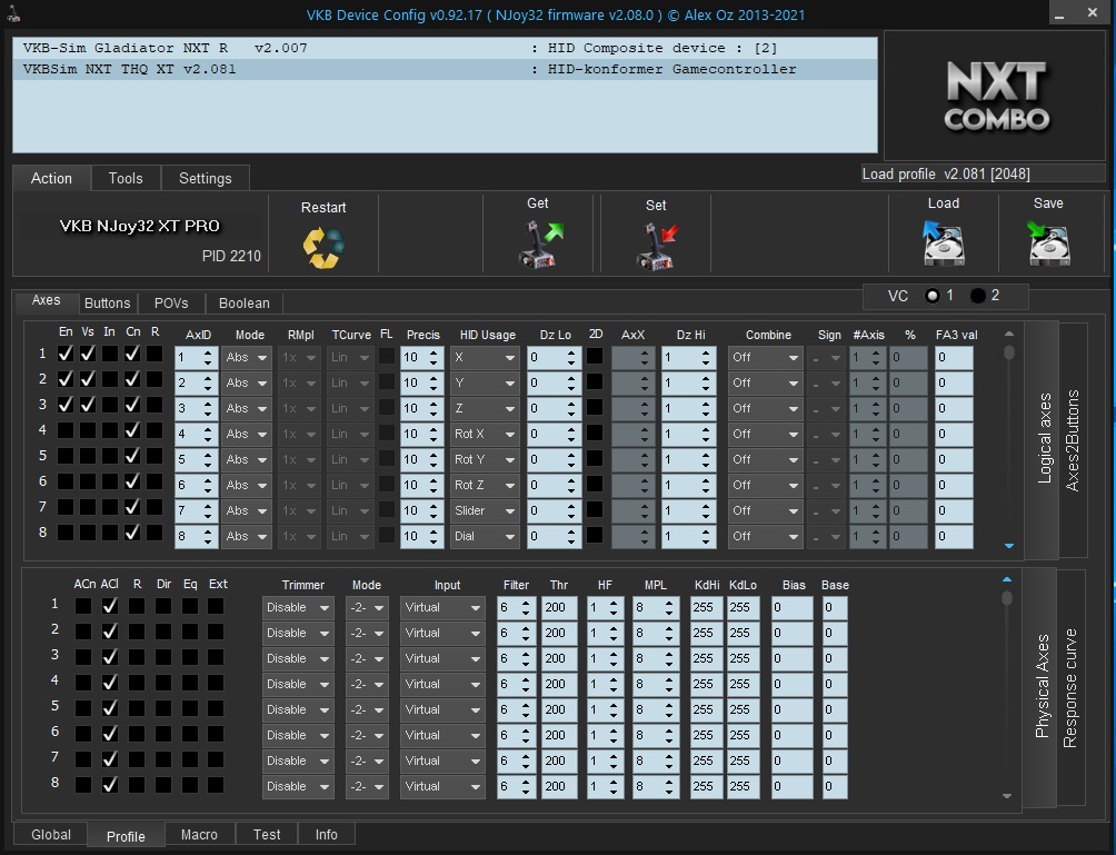 I had to invert the axis because FSX, P3D (both V4 and V5) and MSFS are reading them backwards, which give me control reversion issues with some aircraft that can't be corrected from within the sim. As you can see, all the parameters are the same for all 3 axis, except for High and Low gain coefficients. However, this is not enough for compensating the issue as I managed to do so in FSUIPC.